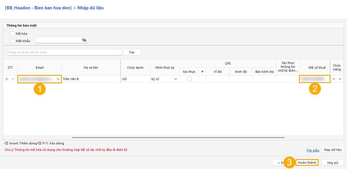 (1) (2) Nhập Email ký số và Mã số thuế của người bán.