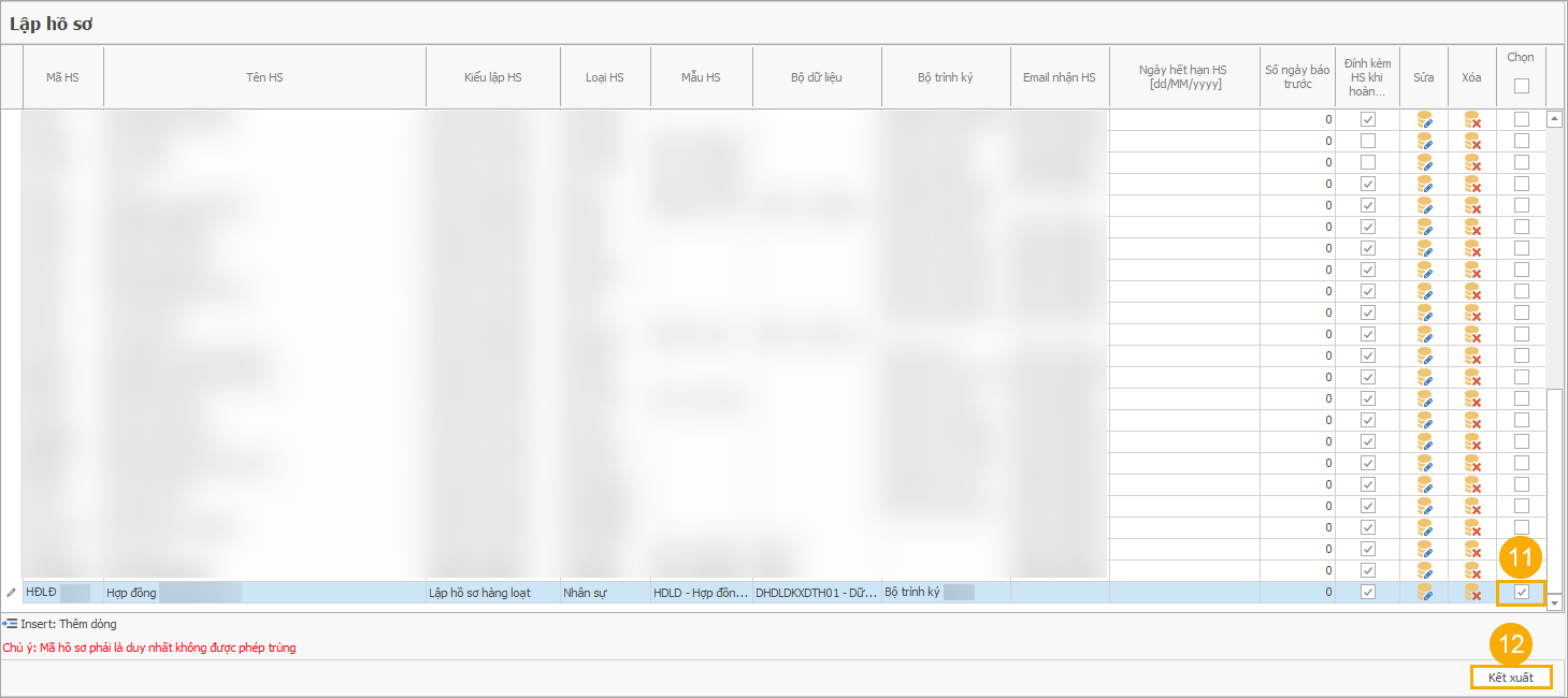 Lưu ý: Mã hồ sơ phải là duy nhất không được phép trùng.