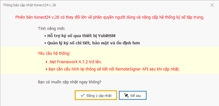 Lưu ý: Konect24 phiên bản v26 yêu cầu hệ thống .Net Framwork 4.7.2 trở lên.