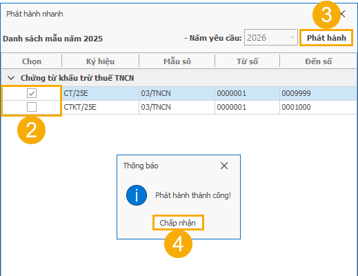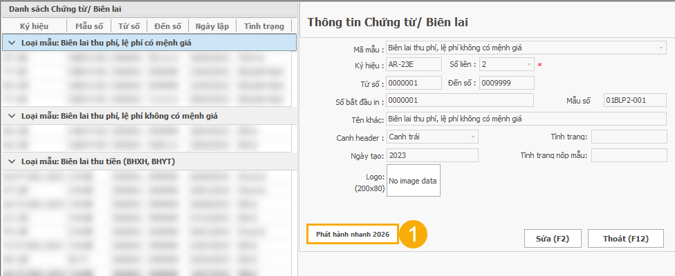 (1) Tại bảng Danh sách Chứng từ/ Biên lai, chọn Phát hành nhanh <yyyy> (*)