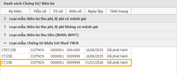 (6) Xem lại Danh sách Chứng từ/ Biên lai, lúc này sẽ thấy xuất hiện thêm thông tin Chứng từ/ Biên lai đã được phát hành nhanh cho năm tài chính mới.