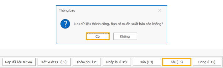 - Cách 1: Người dùng kê khai tờ khai, bấm Ghi (F5) > bấm Có để kết xuất báo cáo.