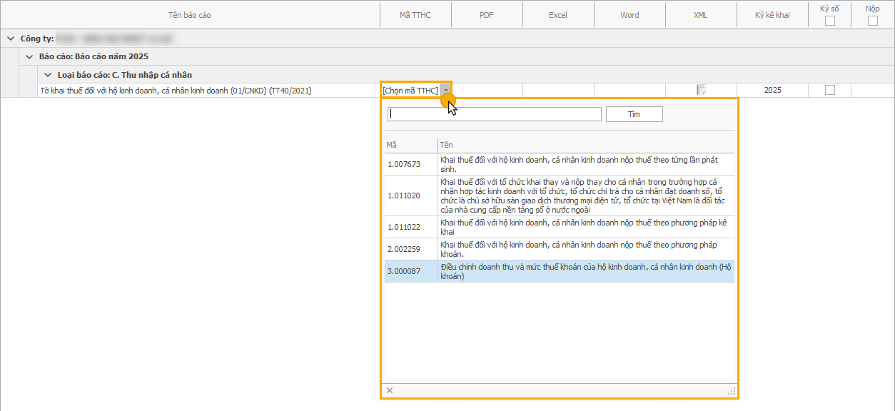 Bài viết hướng dẫn chọn mã thủ tục hành chính (TTHC) tại giao diện kết xuất báo cáo trên TaxOnline.