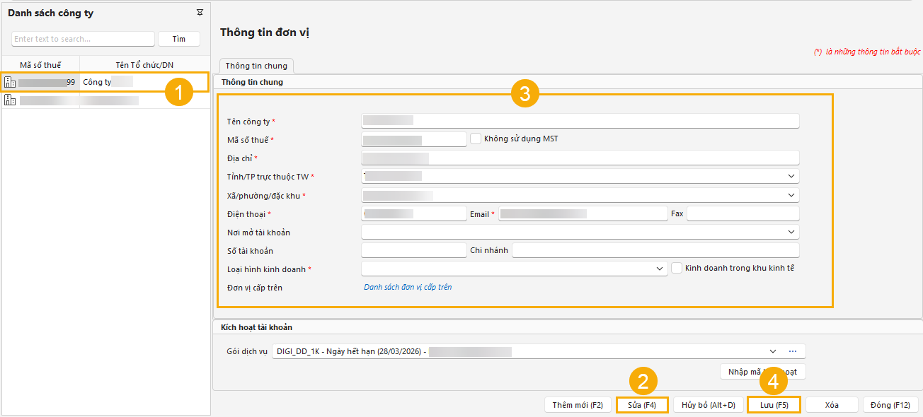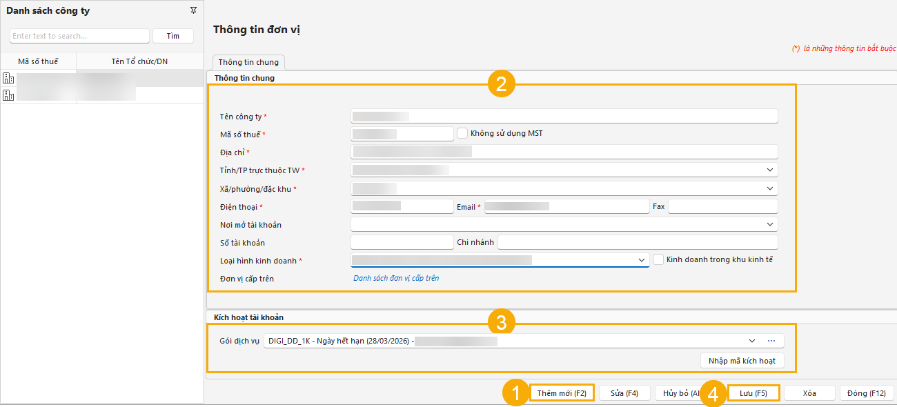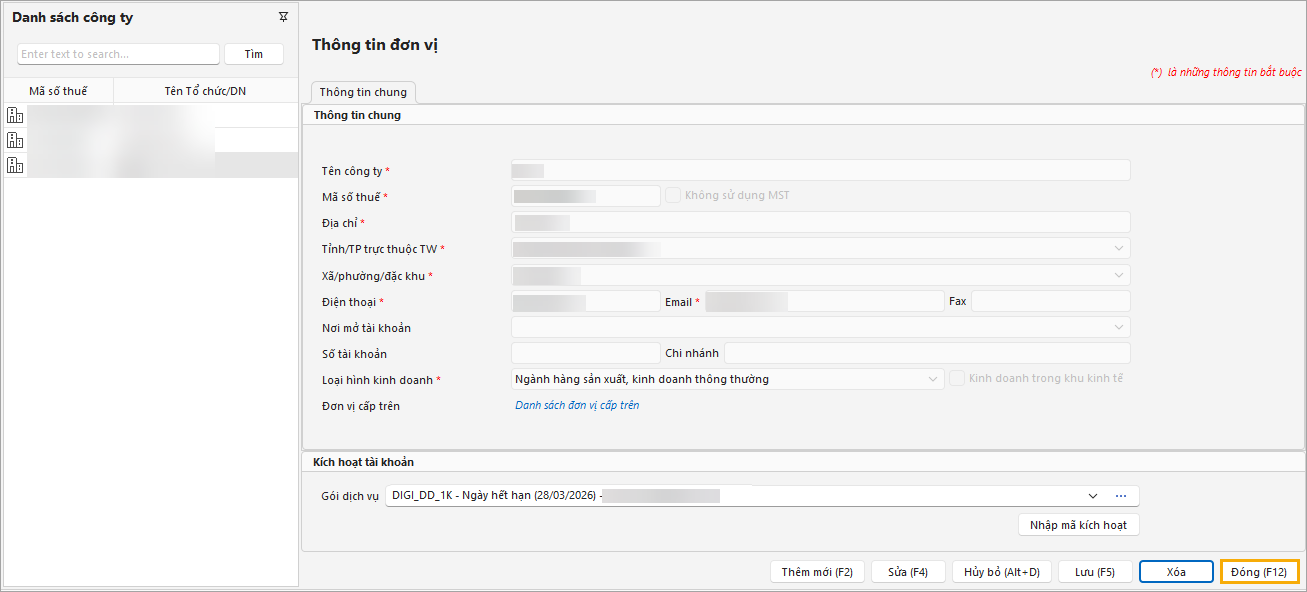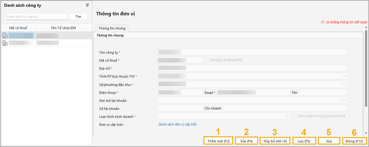 - Chức năng: Lưu lại toàn bộ thông tin đơn vị sau khi hoàn tất nhập liệu ở Thêm mới (F2) (mục 1) hoặc Sửa (F4) (mục 2).