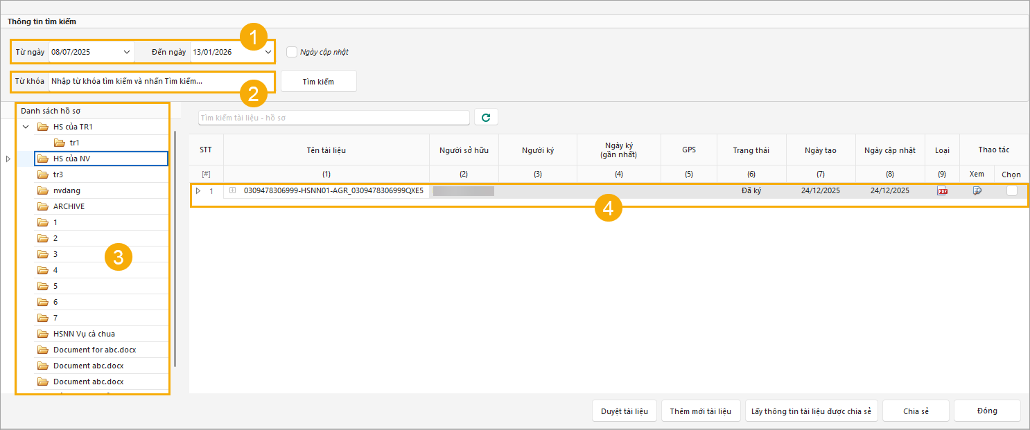 (4) Danh sách tài liệu tương ứng với thư mục (hồ sơ) đang chọn ở Danh sách hồ sơ.
