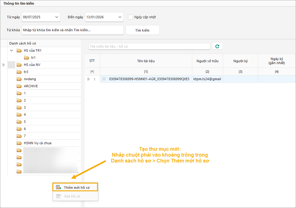 Nhấp chuột phải vào tên thư mục đã có và chọn Thêm mới hồ sơ.