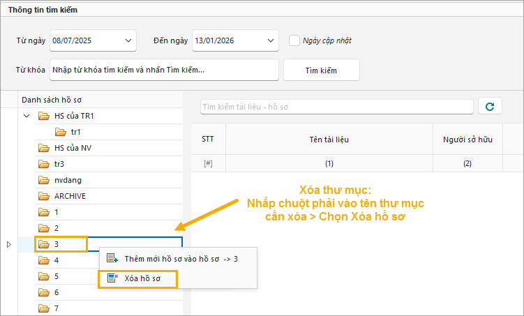 Nhấp chuột phải vào tên thư mục cần xoá, chọn Xoá hồ sơ để thực hiện xoá thư mục đã chọn.