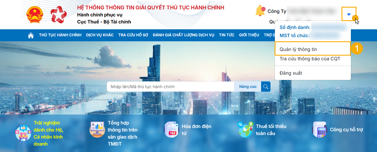 (1) Tại Thông tin công ty, bấm vào mũi tên, chọn Quản lý thông tin.