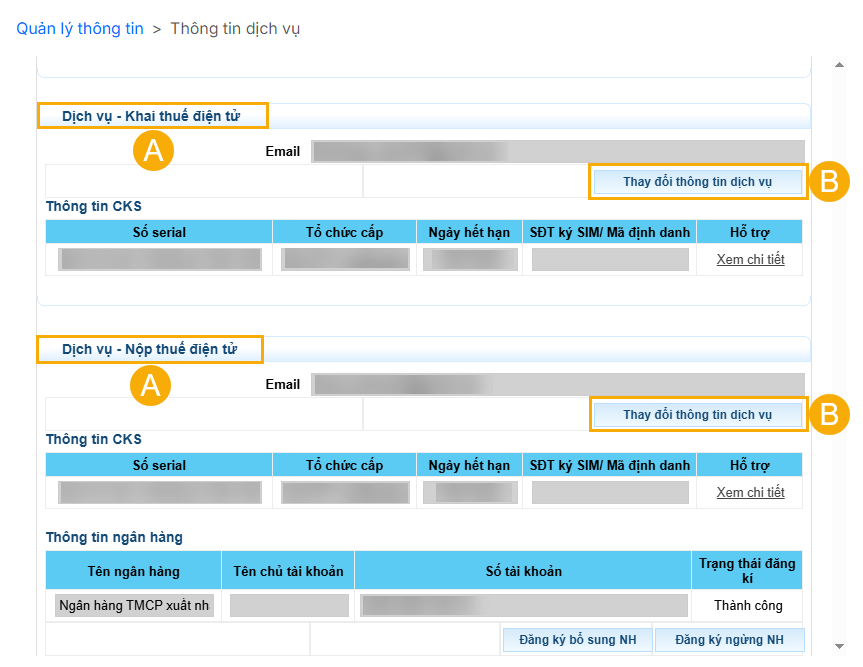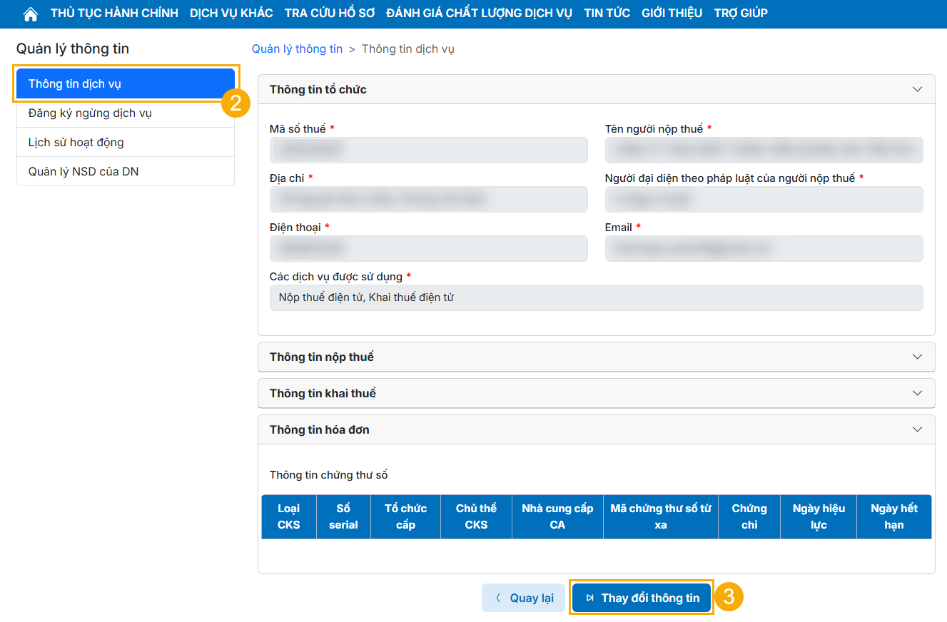 (2) Tại mục Quản lý thông tin, chọn vào Thông tin dịch vụ.