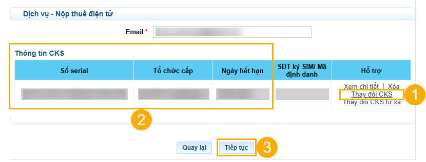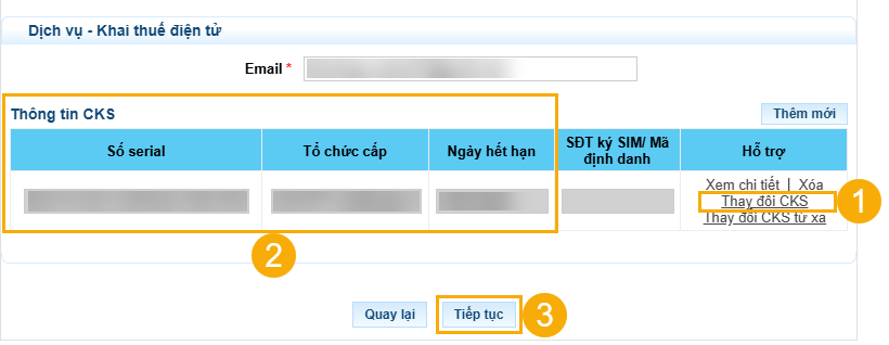 (1) Tại giao diện Thay đổi thông tin dịch vụ nhấn chọn Thay đổi CKS.