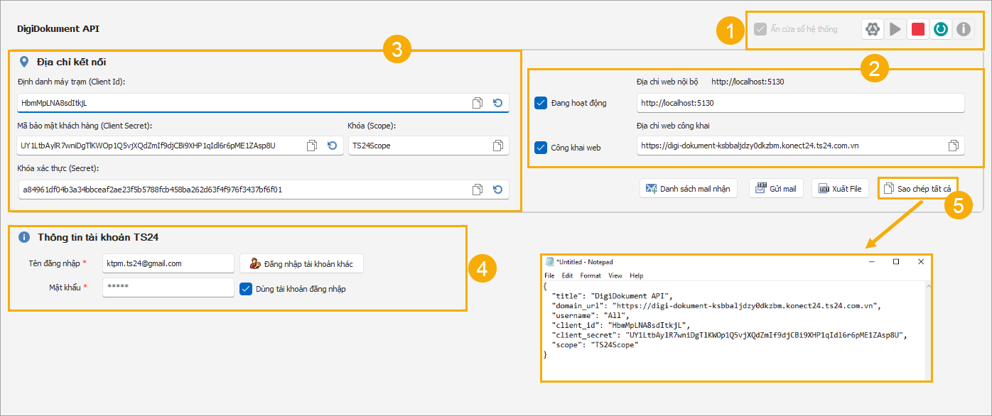 (2) Hiển thị địa chỉ web nội bộ, địa chỉ web công khai khi chạy kết nối DigiDokument API.