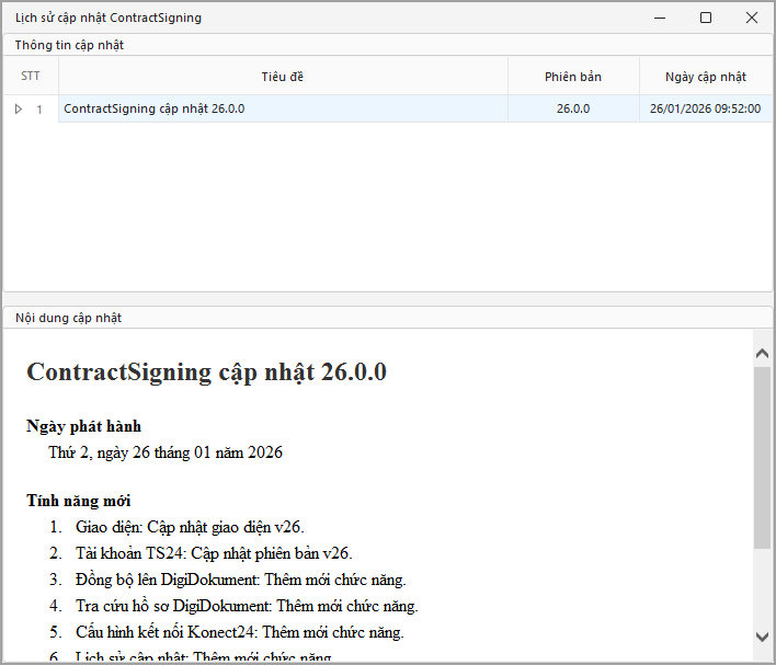 Chức năng Lịch sử cập nhật cho phép người dùng theo dõi các phiên bản ContractSigning đã được phát hành. Tại đây, người dùng có thể xem thông tin phiên bản, thời gian cập nhật và nội dung thay đổi tương ứng, bao gồm các tính năng mới và các cải tiến hệ thống.