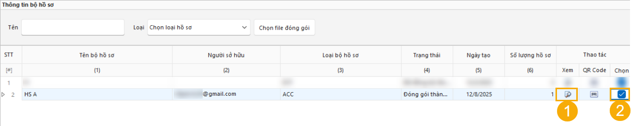(2) Cột Chọn: Tích vào ô vuông để chọn bộ hồ sơ.