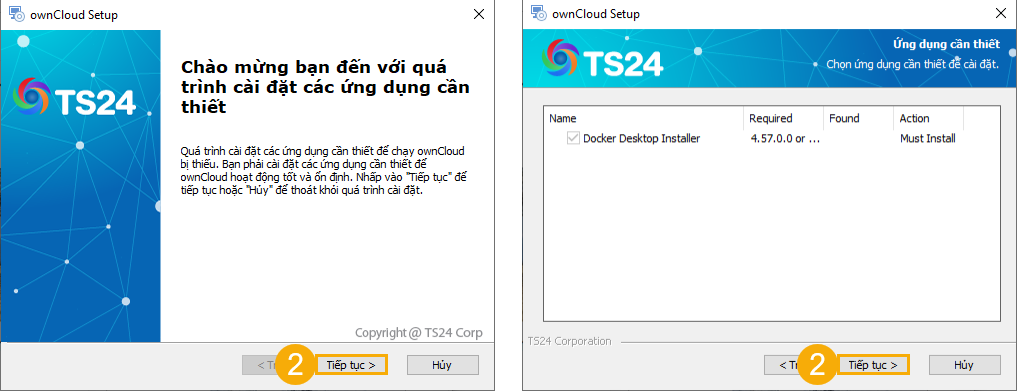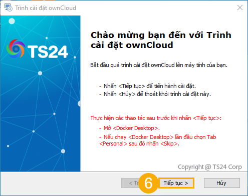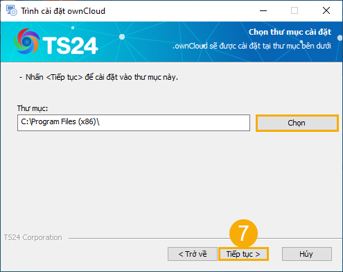 (6) Quay lại Trình cài đặt ownCloud, nhấn Tiếp tục.