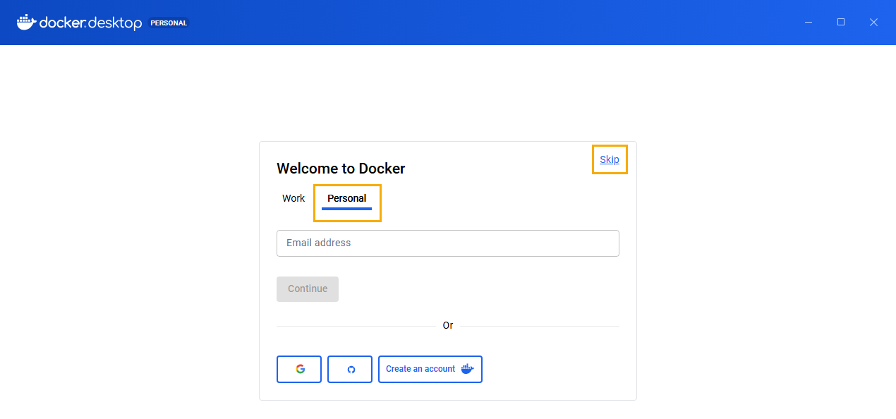 - Nếu chạy Docker Desktop lần đầu, vào tab Personal nhấn Skip để qua bước tiếp theo của cài đặt.