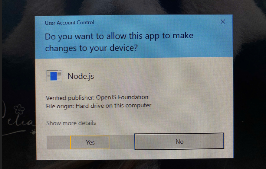 Hệ thống hiển thị cửa sổ User Account Control để xác nhận việc cho phép ứng dụng thực hiện thay đổi trên máy tính. Chọn Yes để tiếp tục cài đặt.