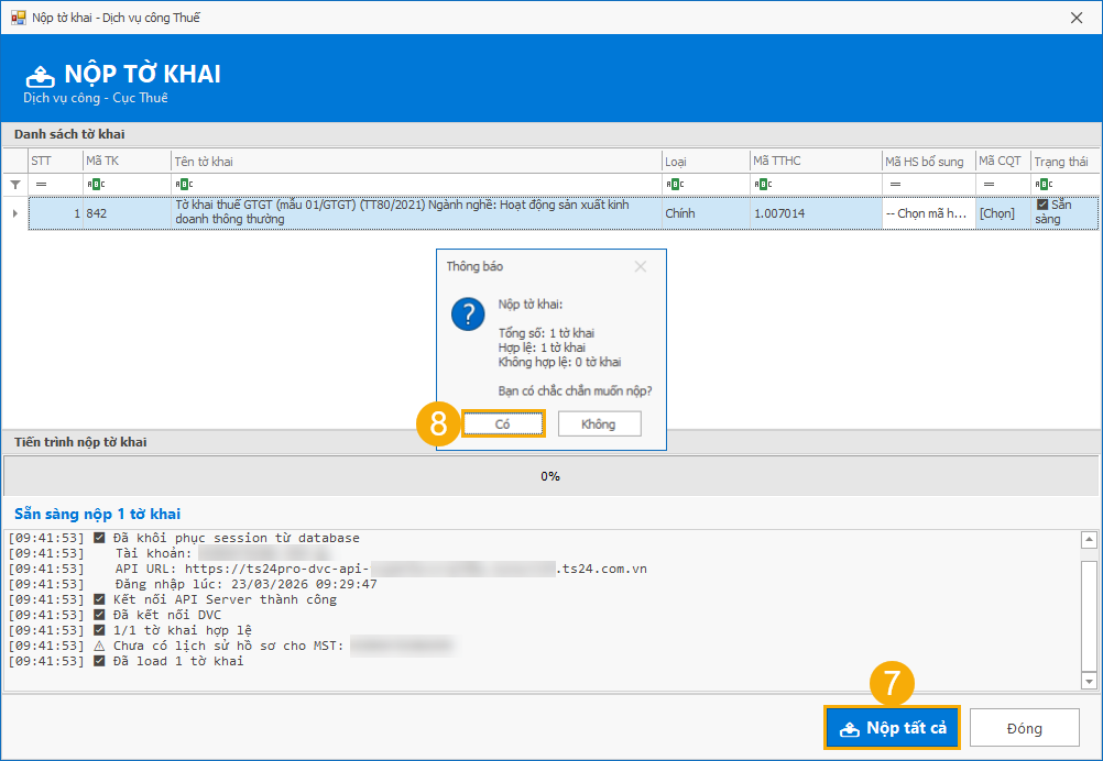 (7) Tại giao diện Nộp tờ khai, bấm vào Nộp tất cả.