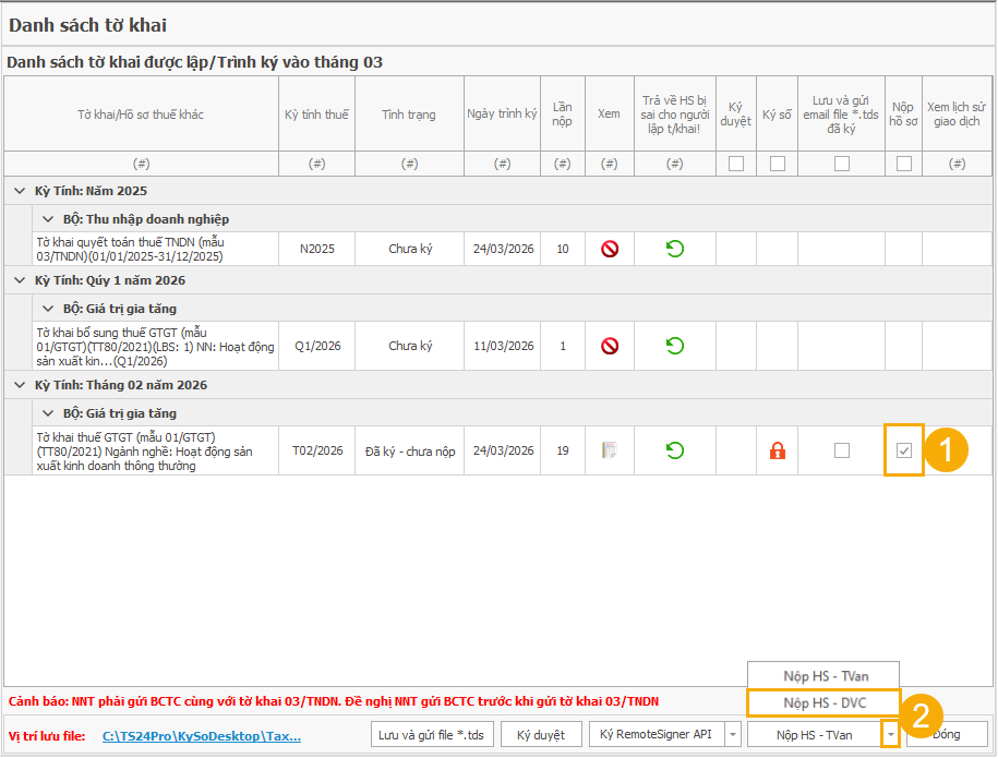 B. Hướng dẫn nộp tờ khai đã ký qua HS - Tvan hoặc Nộp HS - DVC: