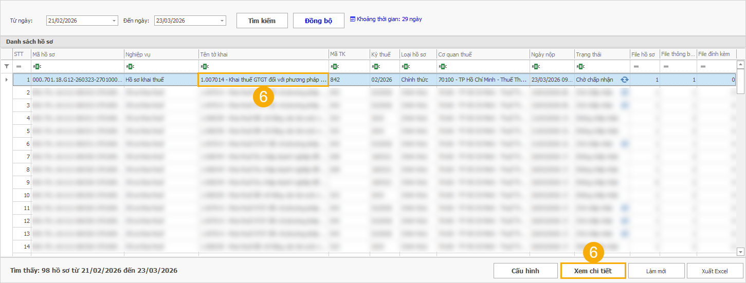 (6) Nhấp đúp chuột vào tên tờ khai hoặc bấm nút Xem chi tiết để xem thông tin tờ khai.